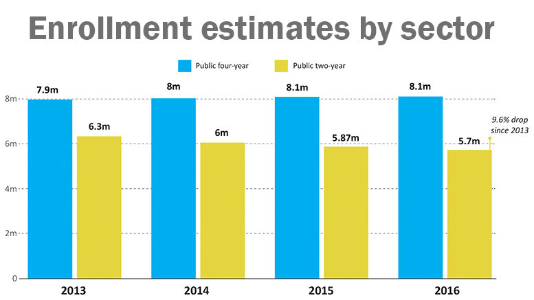 Enrollment trend: Public two-year colleges have seen a 9.6 percent dip in enrollment since 2013.