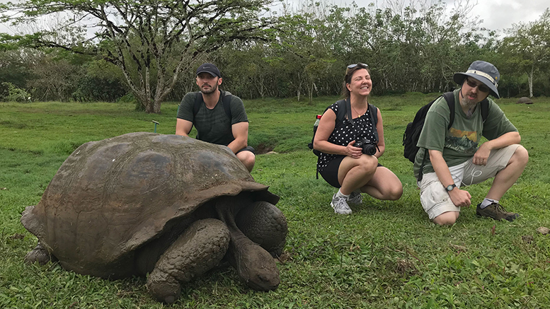 Community College of Allegheny students gather for a photo with one of the famed giant tortoises on the Galapagos Islands. (Photo: CCAC)