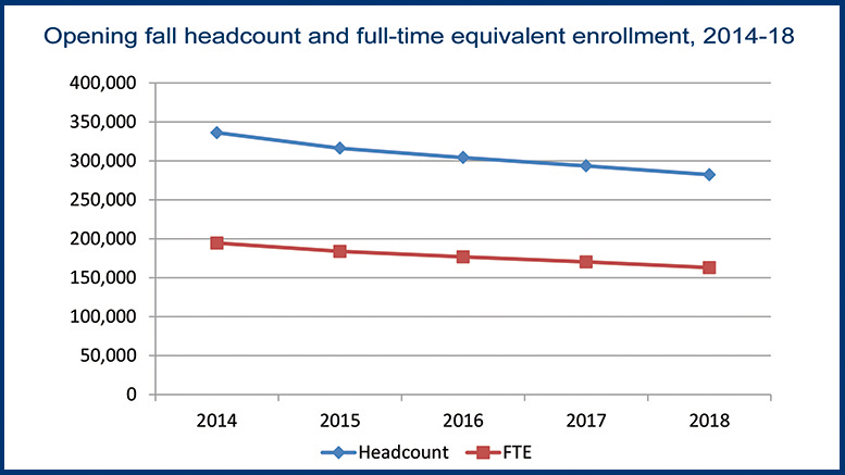 In response, colleges are focusing on the costs of delivering courses and programs to make more effective decisions about course offerings based on student needs, the report said. One important area of growth to meet student needs is online education. Fall 2018 online enrollments increased 4 percent, with 2,520 more students than fall 2017.