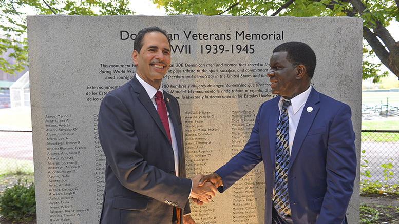 New York City Council Member Fernando Cabrera (left) and Bronx Community College President Thomas Isekenegbe stand before the newly unveiled World War II Dominican Veterans Monument at the college campus. (Photo: BCC)