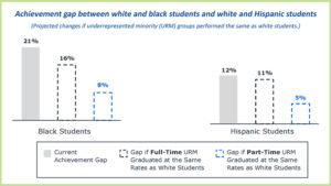 However, if we focus on closing the achievement gap among part-time student populations, the gap between black and white students would close by 13 points — a difference of 62 percent — and the gap between Hispanic and white students would improve by 7 points — closing the gap by 58 percent.