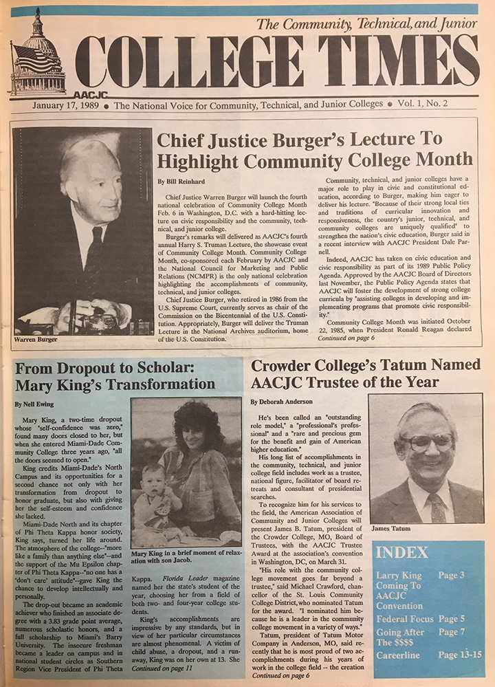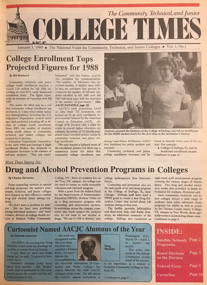 This month marks the 30th anniversary of AACC’s Community College Daily, which started in 1989 as the biweekly Community, Technical and Junior College Times. Below are the front pages of the first three issues. Thanks to all AACC-member colleges for your support!
