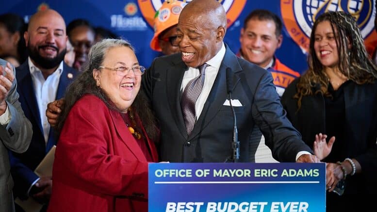 Hostos Community College President Cocco De Filippis stands with New York City Mayor Eric Adams at a press conference announcing funding for a new facility for the college. (Photo: Hostos)